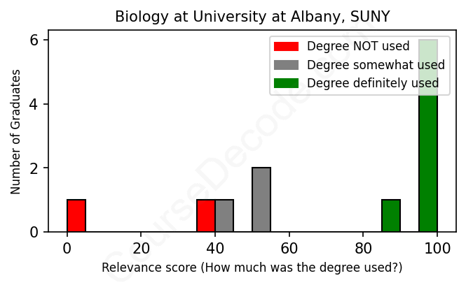 The verdict? Slightly above average. Overall, with an average relevance score of 72%, Biology graduates from University at Albany, SUNY have a slightly higher likelihood (+5%) of finding work in this field compared to the average graduate across all fields: