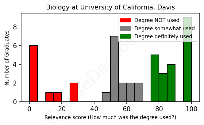 The verdict? Below average. Overall, with an average relevance score of 60%, Biology graduates from University of California, Davis have a lower likelihood (-7%) of finding work in this field compared to the average graduate across all fields: