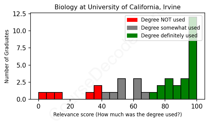 The verdict? Slightly above average. Overall, with an average relevance score of 71%, Biology graduates from University of California, Irvine have a slightly higher likelihood (+4%) of finding work in this field compared to the average graduate across all fields:
