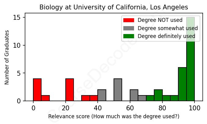 The verdict? On par with the average. Overall, with an average relevance score of 67%, Biology graduates from University of California, Los Angeles have about the same likelihood of finding work in this field as the average graduate across all fields: