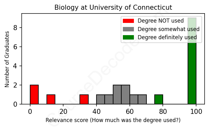 The verdict? Slightly below average. Overall, with an average relevance score of 65%, Biology graduates from University of Connecticut have a slightly lower likelihood (-2%) of finding work in this field compared to the average graduate across all fields: