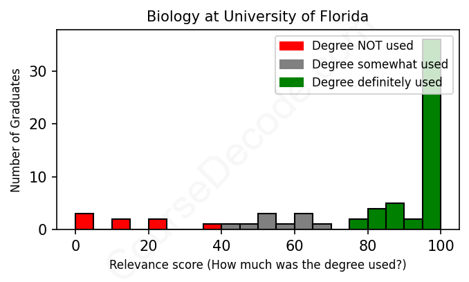 The verdict? Significantly above average. Overall, with an average relevance score of 79%, Biology graduates from University of Florida have a much higher likelihood (+12%) of finding work in this field compared to the average graduate across all fields: