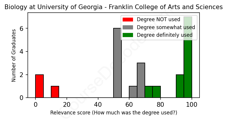 The verdict? Slightly below average. Overall, with an average relevance score of 66%, Biology graduates from University of Georgia - Franklin College of Arts and Sciences have a slightly lower likelihood (-1%) of finding work in this field compared to the average graduate across all fields: