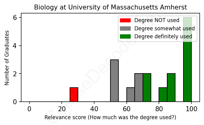 The verdict? Above average. Overall, with an average relevance score of 76%, Biology graduates from University of Massachusetts Amherst have a higher likelihood (+9%) of finding work in this field compared to the average graduate across all fields: