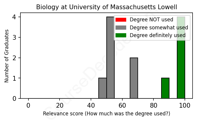 First, some facts. Of the Biology graduates from University of Massachusetts Lowell we've analyzed , here's how many have used (or NOT used) their degree in their career: