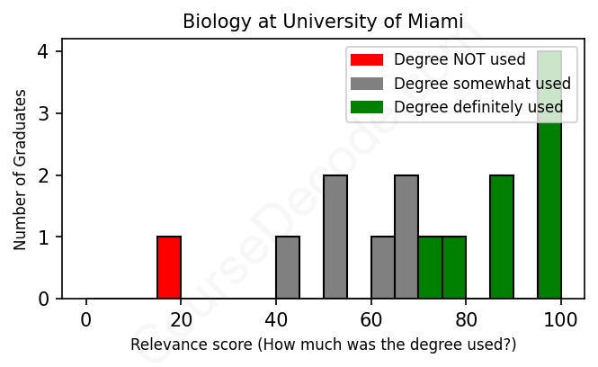 The verdict? Slightly above average. Overall, with an average relevance score of 72%, Biology graduates from University of Miami have a slightly higher likelihood (+5%) of finding work in this field compared to the average graduate across all fields: