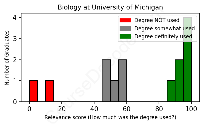 The verdict? Slightly below average. Overall, with an average relevance score of 66%, Biology graduates from University of Michigan have a slightly lower likelihood (-1%) of finding work in this field compared to the average graduate across all fields: