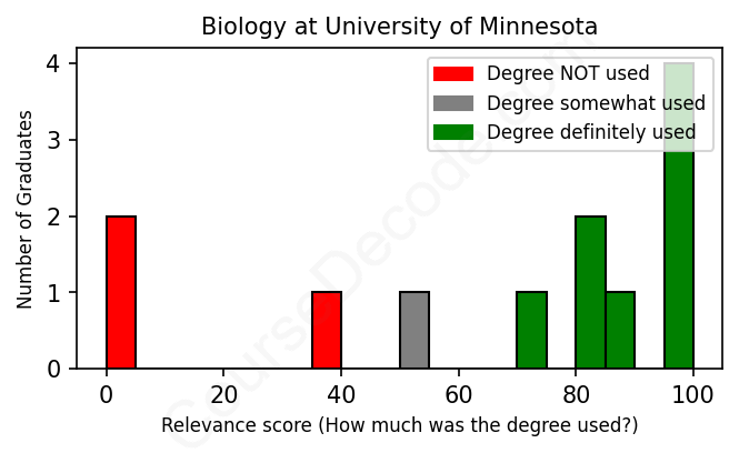 The verdict? On par with the average. Overall, with an average relevance score of 67%, Biology graduates from University of Minnesota have about the same likelihood of finding work in this field as the average graduate across all fields: