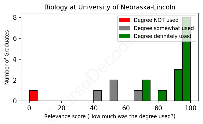 The verdict? Significantly above average. Overall, with an average relevance score of 79%, Biology graduates from University of Nebraska-Lincoln have a much higher likelihood (+12%) of finding work in this field compared to the average graduate across all fields: