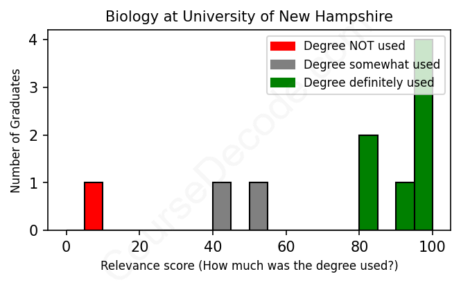 The verdict? Above average. Overall, with an average relevance score of 75%, Biology graduates from University of New Hampshire have a higher likelihood (+8%) of finding work in this field compared to the average graduate across all fields: