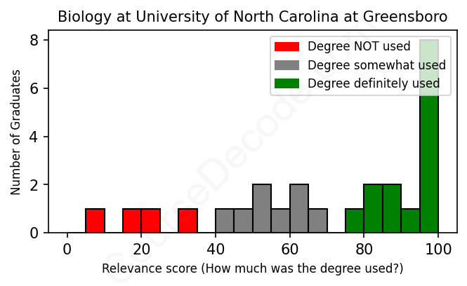 The verdict? Slightly above average. Overall, with an average relevance score of 70%, Biology graduates from University of North Carolina at Greensboro have a slightly higher likelihood (+3%) of finding work in this field compared to the average graduate across all fields: