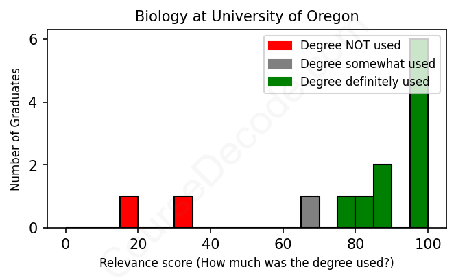 The verdict? Significantly above average. Overall, with an average relevance score of 80%, Biology graduates from University of Oregon have a much higher likelihood (+13%) of finding work in this field compared to the average graduate across all fields: