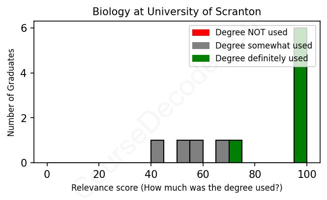 The verdict? Significantly above average. Overall, with an average relevance score of 80%, Biology graduates from University of Scranton have a much higher likelihood (+13%) of finding work in this field compared to the average graduate across all fields: