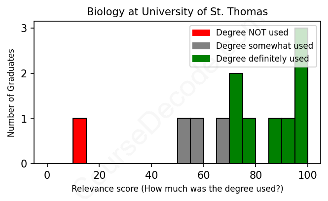 The verdict? Above average. Overall, with an average relevance score of 73%, Biology graduates from University of St. Thomas have a higher likelihood (+6%) of finding work in this field compared to the average graduate across all fields: