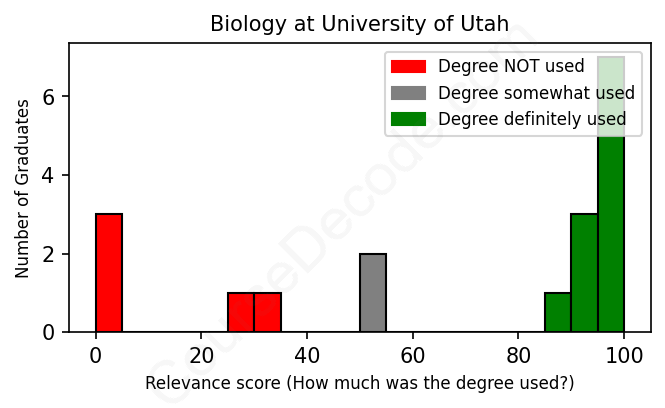 The verdict? Slightly above average. Overall, with an average relevance score of 68%, Biology graduates from University of Utah have a slightly higher likelihood (+1%) of finding work in this field compared to the average graduate across all fields: