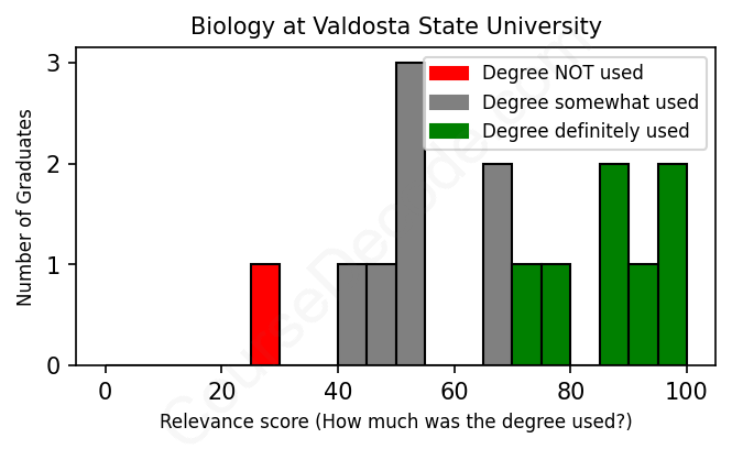 The verdict? Slightly above average. Overall, with an average relevance score of 68%, Biology graduates from Valdosta State University have a slightly higher likelihood (+1%) of finding work in this field compared to the average graduate across all fields: