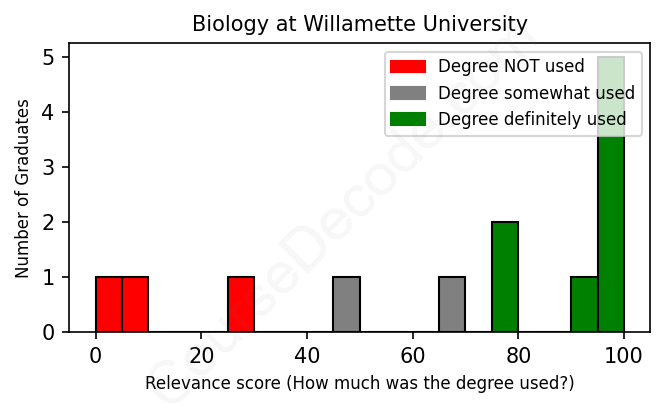The verdict? Slightly above average. Overall, with an average relevance score of 68%, Biology graduates from Willamette University have a slightly higher likelihood (+1%) of finding work in this field compared to the average graduate across all fields: