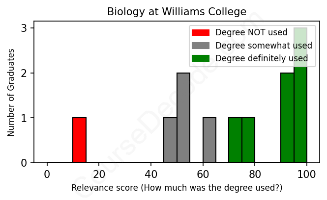 The verdict? Slightly above average. Overall, with an average relevance score of 71%, Biology graduates from Williams College have a slightly higher likelihood (+4%) of finding work in this field compared to the average graduate across all fields: