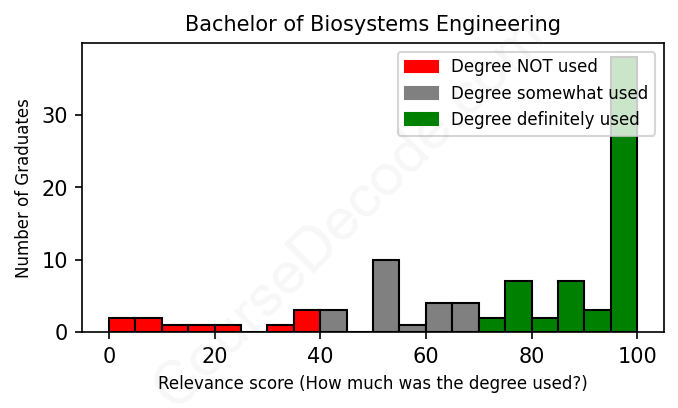 The verdict? Above average. Overall, with an average relevance score of 75%, Biosystems Engineering graduates have a higher likelihood (+8%) of finding work in this field compared to the average graduate across all fields: