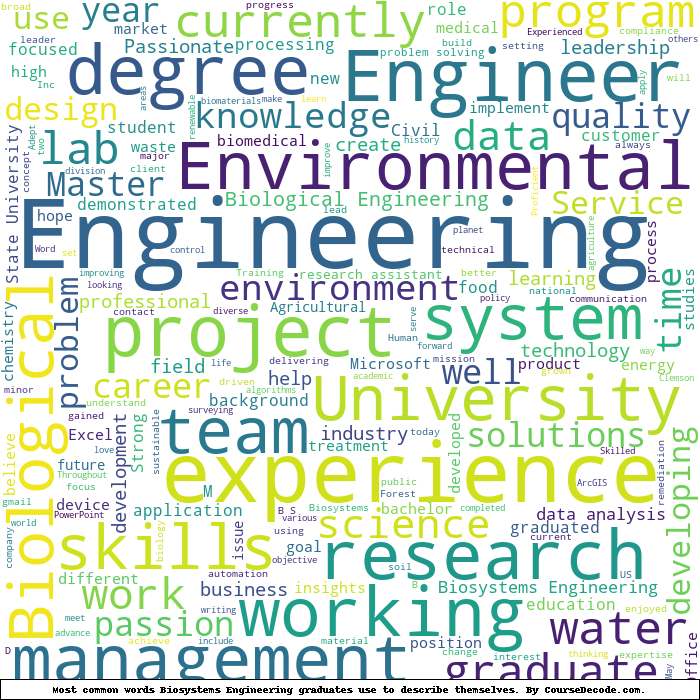 Here is a visual representation of the most common words seen in the "about" section of LinkedIn profiles who have a Bachelor degree in Biosystems Engineering. This may or may not be useful: