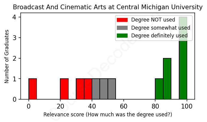 First, some facts. Of the Broadcast And Cinematic Arts graduates from Central Michigan University we've analyzed , here's how many have used (or NOT used) their degree in their career: