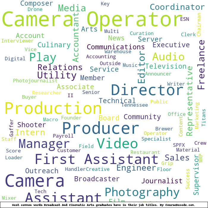 Here is a visual representation of the most common words in job titles for Broadcast And Cinematic Arts graduates (this is across all Broadcast And Cinematic Arts graduates we've analyzed, not just those who went to Central Michigan University):