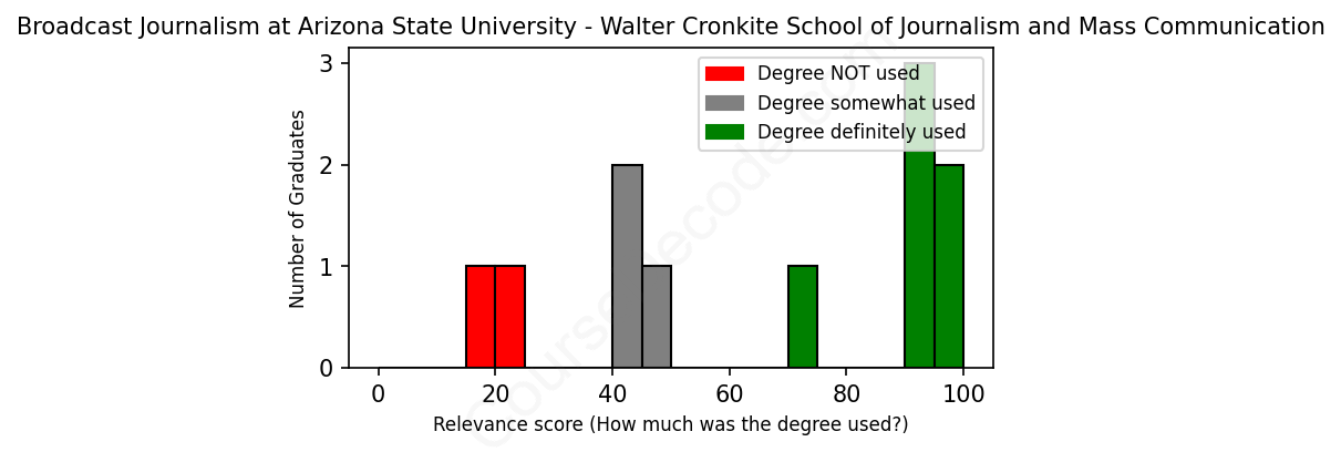 The verdict? Slightly below average. Overall, with an average relevance score of 64%, Broadcast Journalism graduates from Arizona State University - Walter Cronkite School of Journalism and Mass Communication have a slightly lower likelihood (-3%) of finding work in this field compared to the average graduate across all fields: