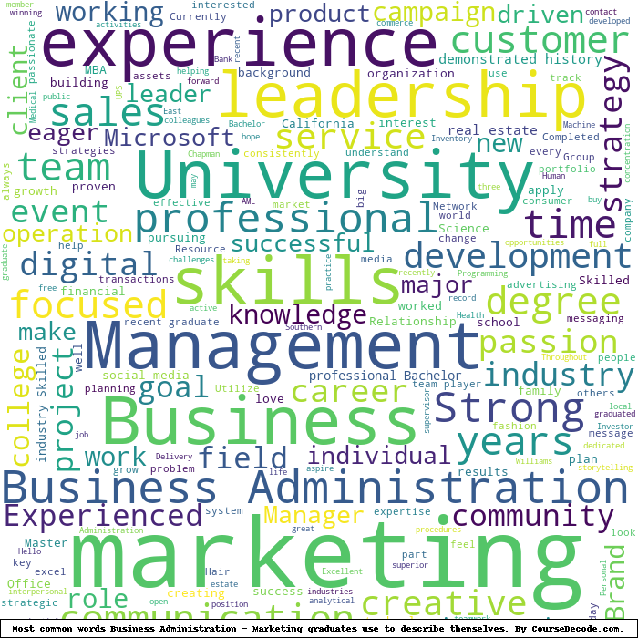Here is a visual representation of the most common words seen in the "about" section of LinkedIn profiles who have a Bachelor degree in Business Administration - Marketing. This may or may not be useful: