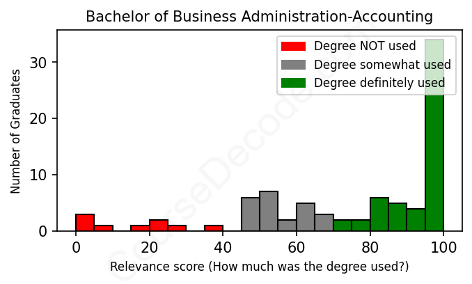The verdict? Significantly above average. Overall, with an average relevance score of 78%, Business Administration-Accounting graduates have a much higher likelihood (+11%) of finding work in this field compared to the average graduate across all fields:
