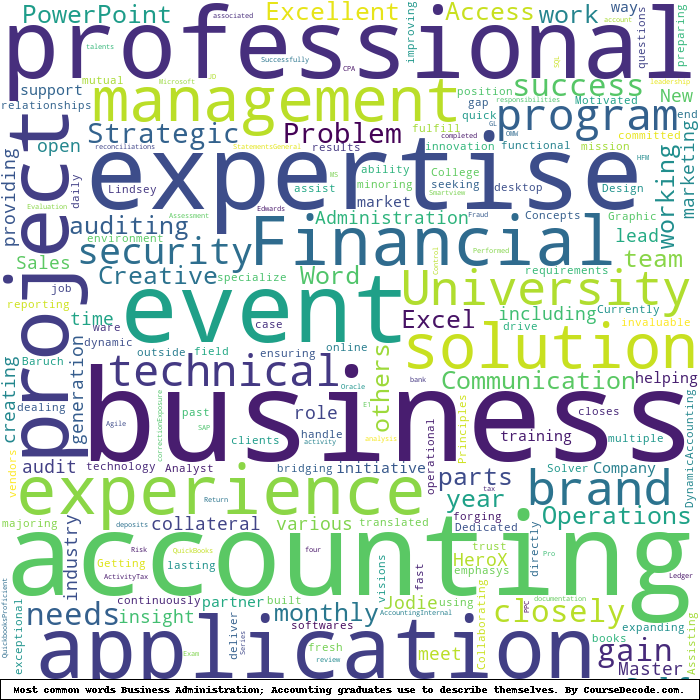 Here is a visual representation of the most common words seen in the "about" section of LinkedIn profiles who have a Bachelor degree in Business Administration-Accounting. This may or may not be useful: