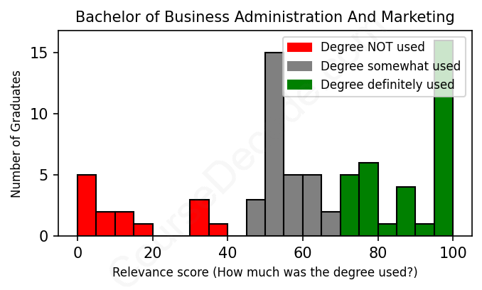 First, some facts. Of the Business Administration And Marketing graduates we've analyzed , here's how many have used (or NOT used) their degree in their career: