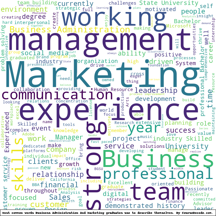 Here is a visual representation of the most common words seen in the "about" section of LinkedIn profiles who have a Bachelor degree in Business Administration And Marketing. This may or may not be useful: