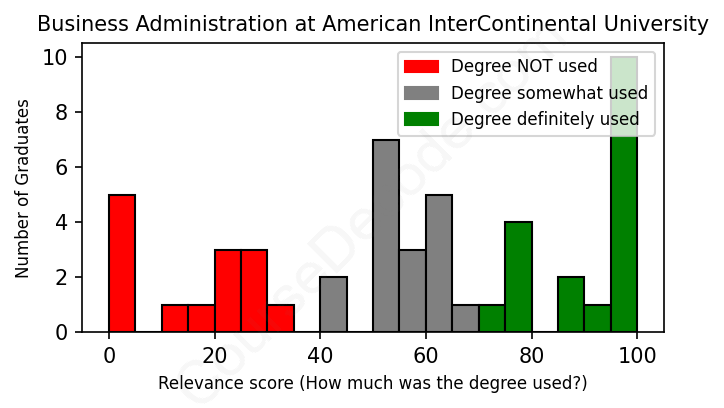 The verdict? Below average. Overall, with an average relevance score of 57%, Business Administration graduates from American InterContinental University have a lower likelihood (-10%) of finding work in this field compared to the average graduate across all fields: