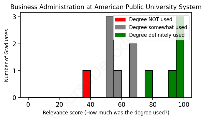 The verdict? Slightly above average. Overall, with an average relevance score of 70%, Business Administration graduates from American Public University System have a slightly higher likelihood (+3%) of finding work in this field compared to the average graduate across all fields: