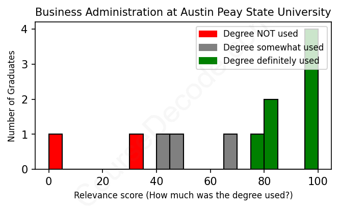 The verdict? Slightly above average. Overall, with an average relevance score of 69%, Business Administration graduates from Austin Peay State University have a slightly higher likelihood (+2%) of finding work in this field compared to the average graduate across all fields: