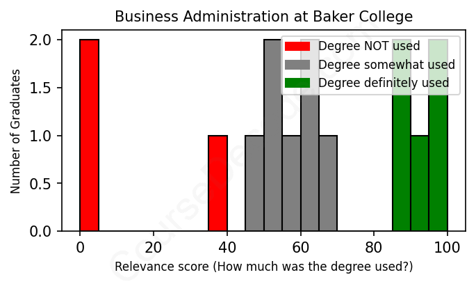 The verdict? Below average. Overall, with an average relevance score of 59%, Business Administration graduates from Baker College have a lower likelihood (-8%) of finding work in this field compared to the average graduate across all fields: