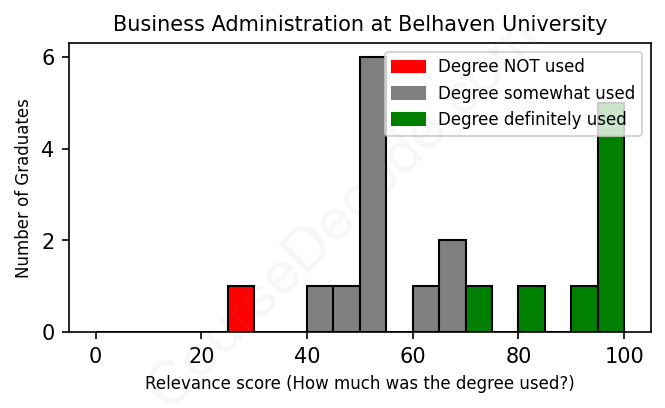 The verdict? Slightly above average. Overall, with an average relevance score of 68%, Business Administration graduates from Belhaven University have a slightly higher likelihood (+1%) of finding work in this field compared to the average graduate across all fields: