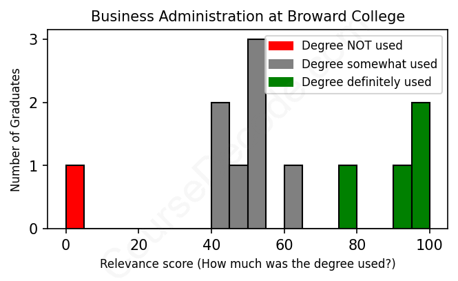The verdict? Below average. Overall, with an average relevance score of 59%, Business Administration graduates from Broward College have a lower likelihood (-8%) of finding work in this field compared to the average graduate across all fields: