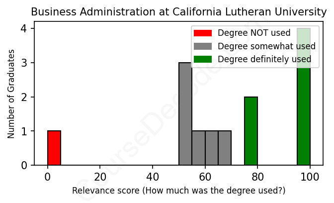 The verdict? Slightly above average. Overall, with an average relevance score of 68%, Business Administration graduates from California Lutheran University have a slightly higher likelihood (+1%) of finding work in this field compared to the average graduate across all fields: