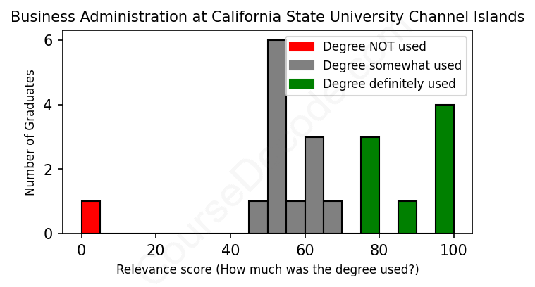 The verdict? Slightly below average. Overall, with an average relevance score of 65%, Business Administration graduates from California State University Channel Islands have a slightly lower likelihood (-2%) of finding work in this field compared to the average graduate across all fields: