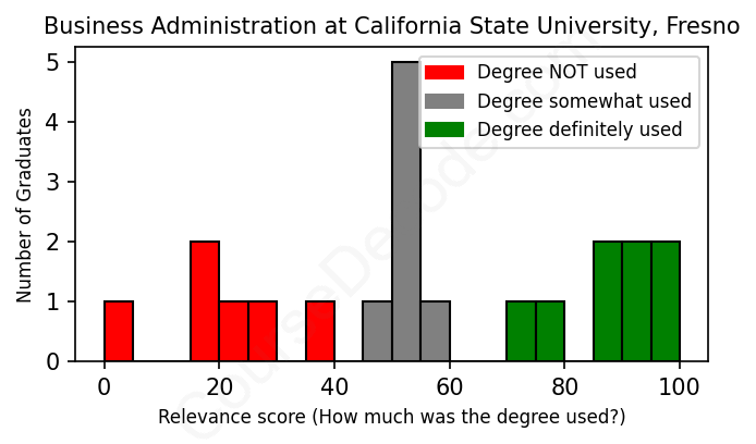 First, some facts. Of the Business Administration graduates from California State University, Fresno we've analyzed , here's how many have used (or NOT used) their degree in their career: