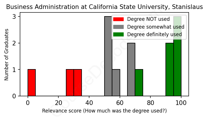 First, some facts. Of the Business Administration graduates from California State University, Stanislaus we've analyzed , here's how many have used (or NOT used) their degree in their career: