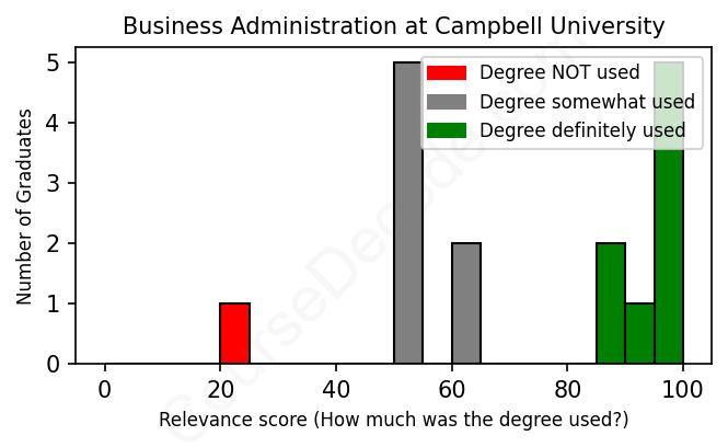 The verdict? Slightly above average. Overall, with an average relevance score of 72%, Business Administration graduates from Campbell University have a slightly higher likelihood (+5%) of finding work in this field compared to the average graduate across all fields: