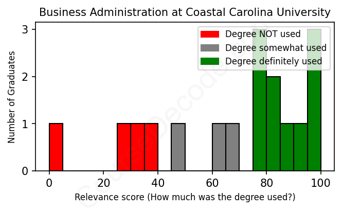 First, some facts. Of the Business Administration graduates from Coastal Carolina University we've analyzed , here's how many have used (or NOT used) their degree in their career: