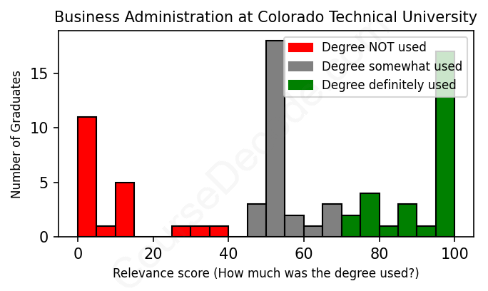 The verdict? Significantly below average. Overall, with an average relevance score of 55%, Business Administration graduates from Colorado Technical University have a much lower likelihood (-12%) of finding work in this field compared to the average graduate across all fields: