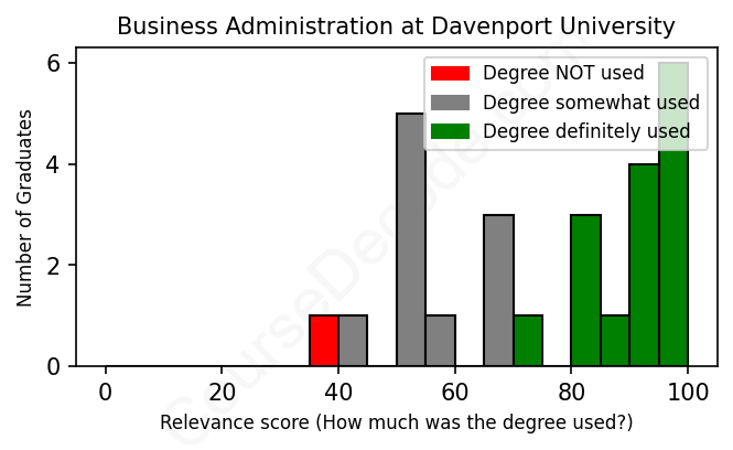 The verdict? Above average. Overall, with an average relevance score of 75%, Business Administration graduates from Davenport University have a higher likelihood (+8%) of finding work in this field compared to the average graduate across all fields: