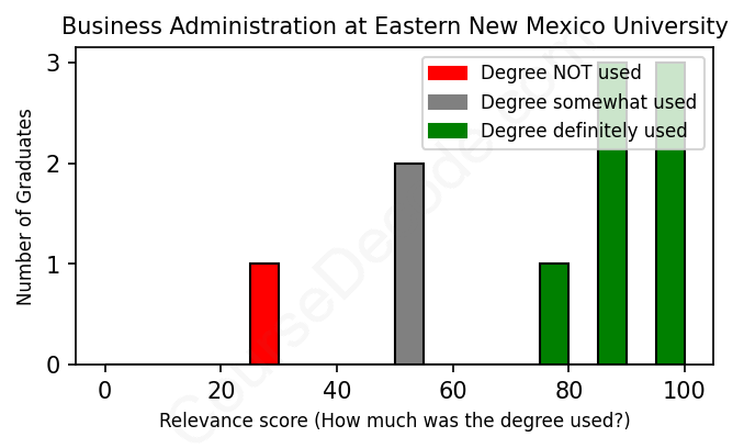 The verdict? Above average. Overall, with an average relevance score of 77%, Business Administration graduates from Eastern New Mexico University have a higher likelihood (+10%) of finding work in this field compared to the average graduate across all fields: