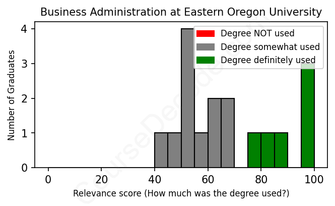 The verdict? On par with the average. Overall, with an average relevance score of 67%, Business Administration graduates from Eastern Oregon University have about the same likelihood of finding work in this field as the average graduate across all fields: