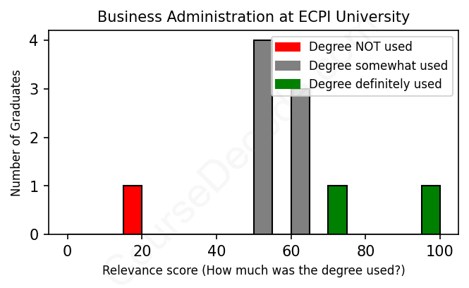 The verdict? Below average. Overall, with an average relevance score of 58%, Business Administration graduates from ECPI University have a lower likelihood (-9%) of finding work in this field compared to the average graduate across all fields: