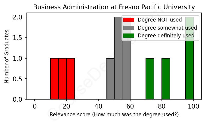 First, some facts. Of the Business Administration graduates from Fresno Pacific University we've analyzed , here's how many have used (or NOT used) their degree in their career: